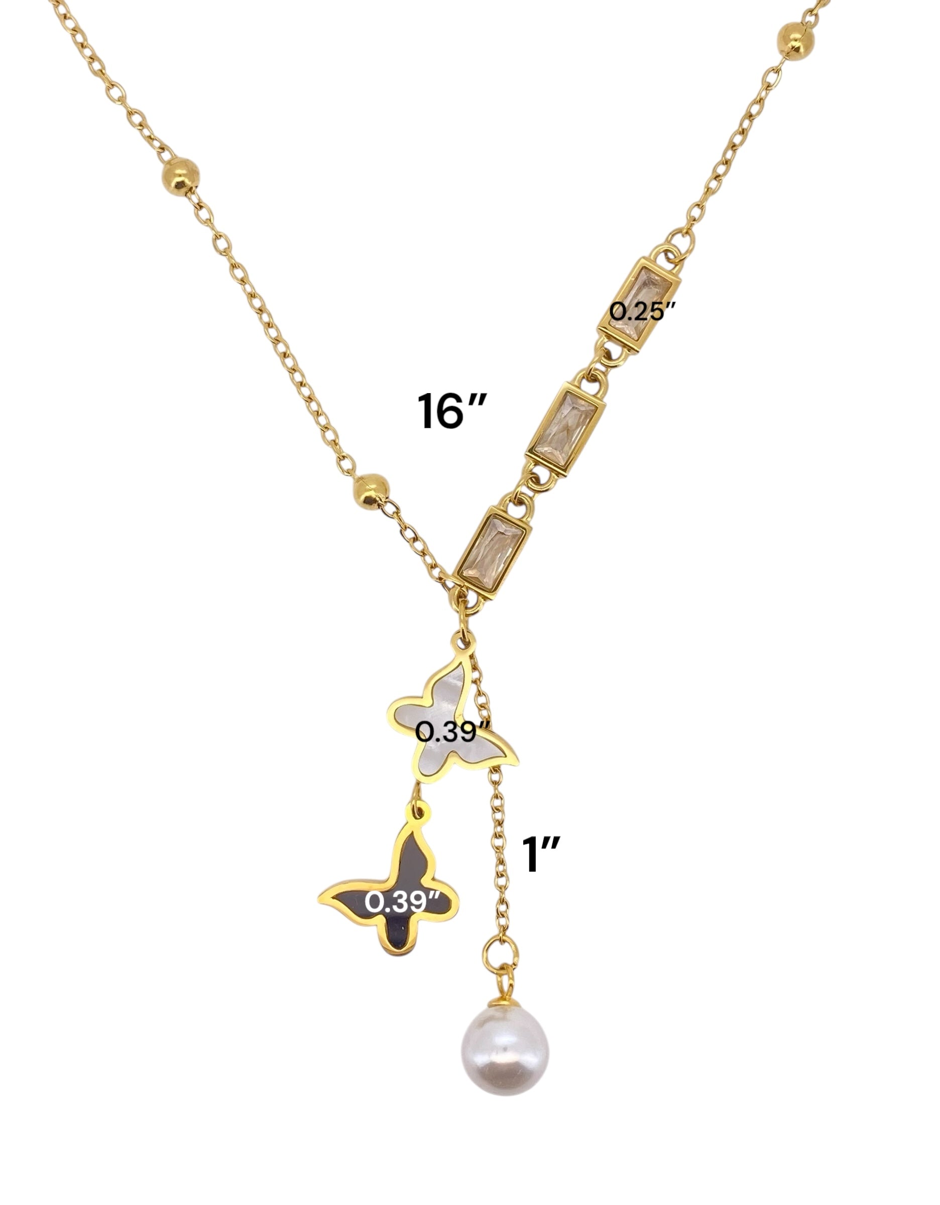 Elevate your style with the Opal Wings Necklace. Crafted with 18k gold plated stainless steel, this necklace features sparkling zircon stones and delicate white and black acrylic butterflies. A perfect addition to any outfit, exuding elegance and sophistication.