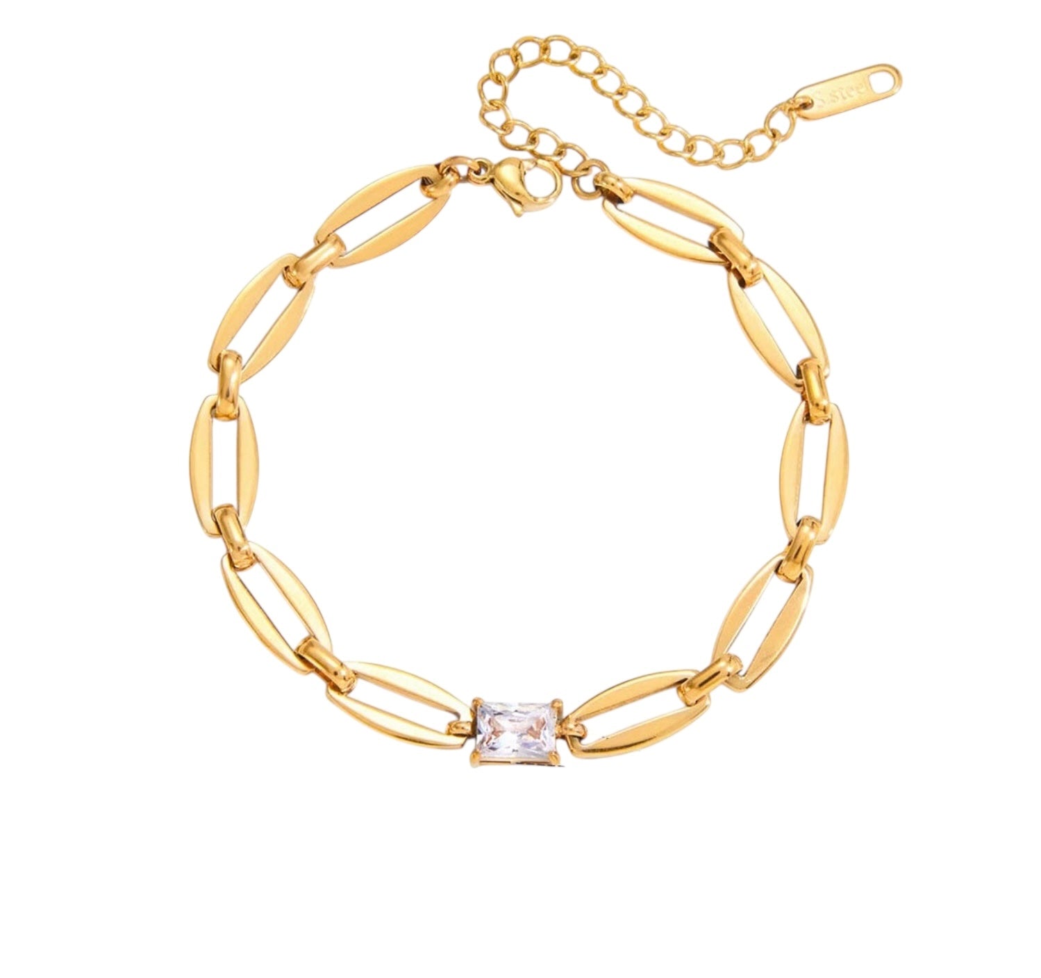Indulge in luxury with the Tori Bracelet. Crafted with 18k gold plated stainless steel, this stunning piece features a dazzling princess cut zircon stone delicately placed on a chain for a touch of sophistication and elegance. Elevate any outfit with this exclusive bracelet.