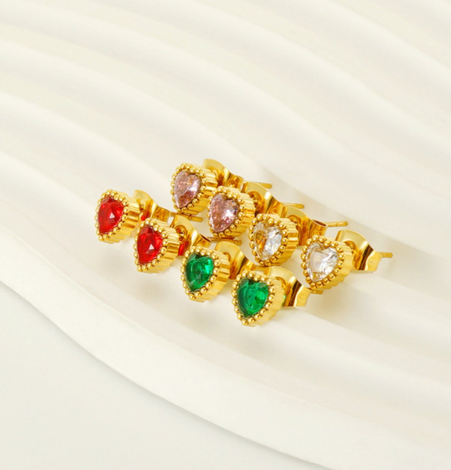 Fall head over heels for our Vionna Earrings! These 18k gold plated heart earrings come in a variety of colors, including white, green, purple, and red zircon stones. Add a touch of elegance and charm to any outfit with these stunning beauties. Love at first sight guaranteed (wink)!